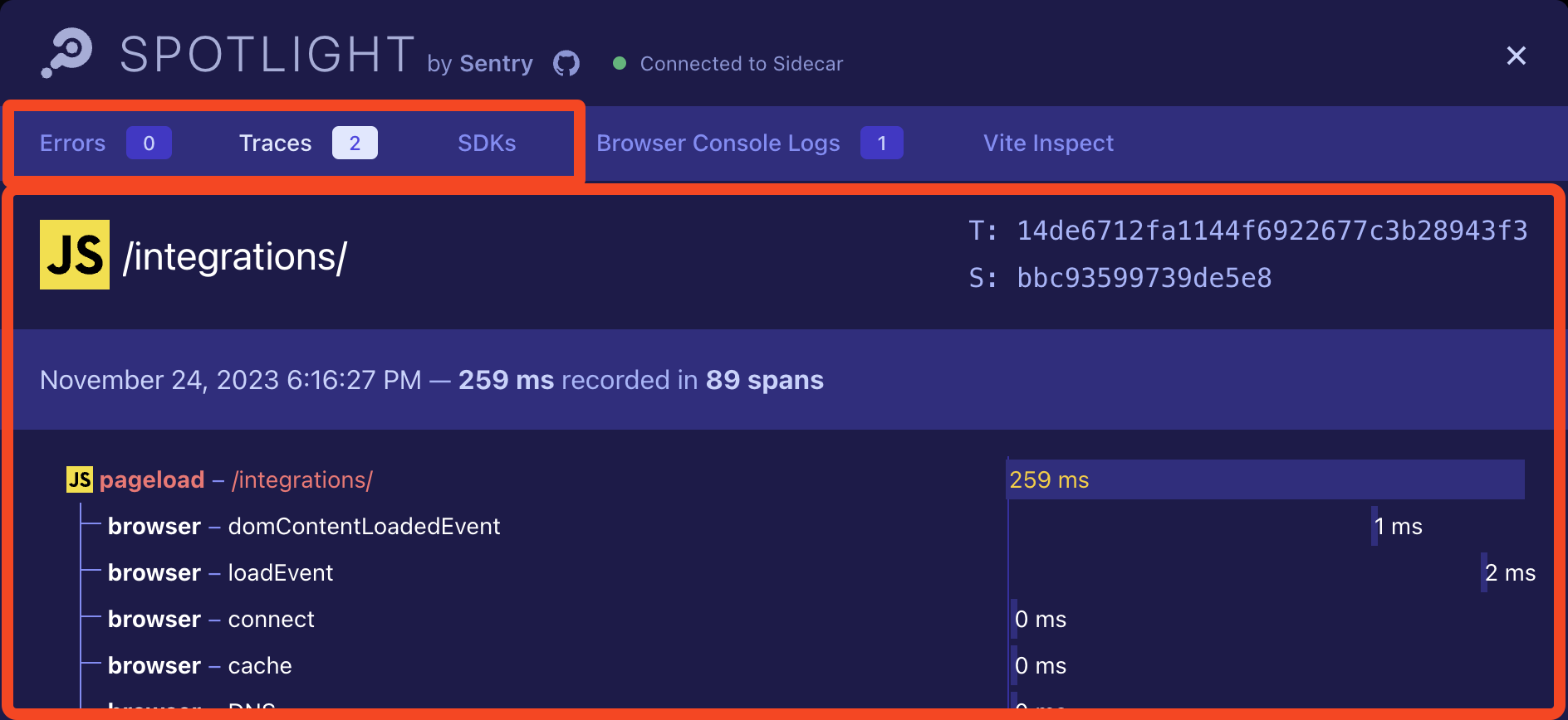 Integrations are how Spotlight exposes behavior in the Overlay. For example, the default Sentry integration enables the Errors and Traces panels.
